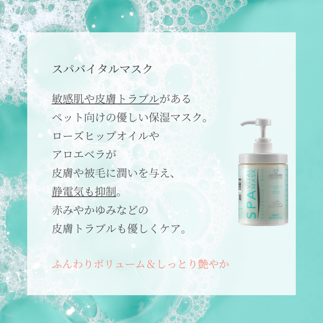 敏感肌や皮膚トラブルがあるペット向けの優しい保湿マスク。アロエベラとローズヒップオイルでダメージのあるお肌も優しくケアし、被毛に潤いを与え、ふわサラな仕上がりに。