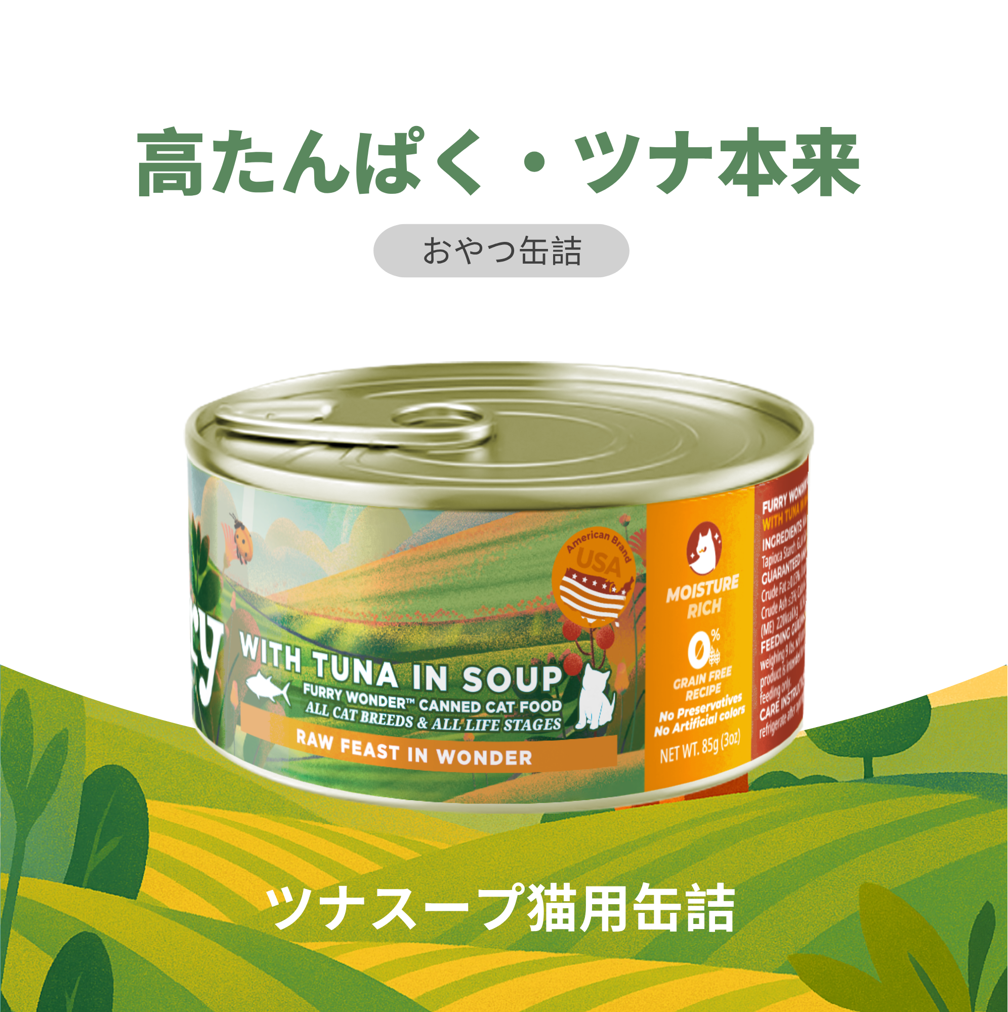 ニュージーランド産の良質なツナを贅沢に使用し、自然の旨味をそのまま閉じ込めたプレミアムキャットフード缶。