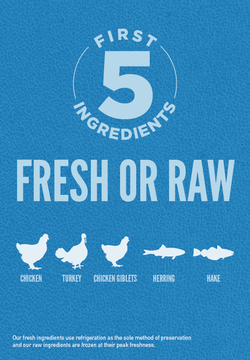 新鮮鶏肉(25%),新鮮七面鳥肉(8%),新鮮鶏内臓(レバー,心臓)(7%),生の丸ごとニシン(6%),生の丸ごとヘイク(5%),新鮮卵(5%),生七面鳥レバー(5%),ディハイドレート鶏肉(4%),ディハイドレート七面鳥肉(4%),ディハイドレートサバ(4%),ディハイドレートイワシ(4%),ディハイドレートニシン(4%),丸ごと赤レンズ豆,丸ごとヒヨコ豆,丸ごとエンドウ豆,鶏脂肪(3%),丸ごと緑レンズ豆,丸ごとピント豆,丸ごと白インゲン豆,レンズ豆繊維,ポロック油(1%),エンドウ豆スターチ,乾燥ケルプ,新鮮丸ごとカボチャ,新鮮丸ごとバターナッツスクワッシュ,新鮮丸ごとズッキーニ,新鮮丸ごとニンジン,新鮮丸ごとリンゴ,新鮮丸こと洋梨,乾燥チコリールート,新鮮ケール,新鮮ホウレン草,新鮮ピートの葉,新鮮カブラ菜,丸ごとクランペリー,丸ごとブルーベリー,丸ごとサスカトゥーンベリー,ターメリック,オオアザミ,ゴボウ,ラベンダー,マシュマロルート、ローズヒップ酸化防止剤:植物油から抽出したトコフェロール:121mgクエン酸:40mg,ーズマリーエキス:80mg 添加栄養素(1kgあたり):3b606(亜鉛:105mg),3b406(銅:11mg),3a821ビタミンB1:10mg,3a672a ビタミンA:3750 1U,3a671 ビタミンD3:5001U,3a700ビタミンE:80IU 添加腸球菌:4b1707エンテロコッカスフェシウム菌 NCIMB10415:1x10^9 CFU.